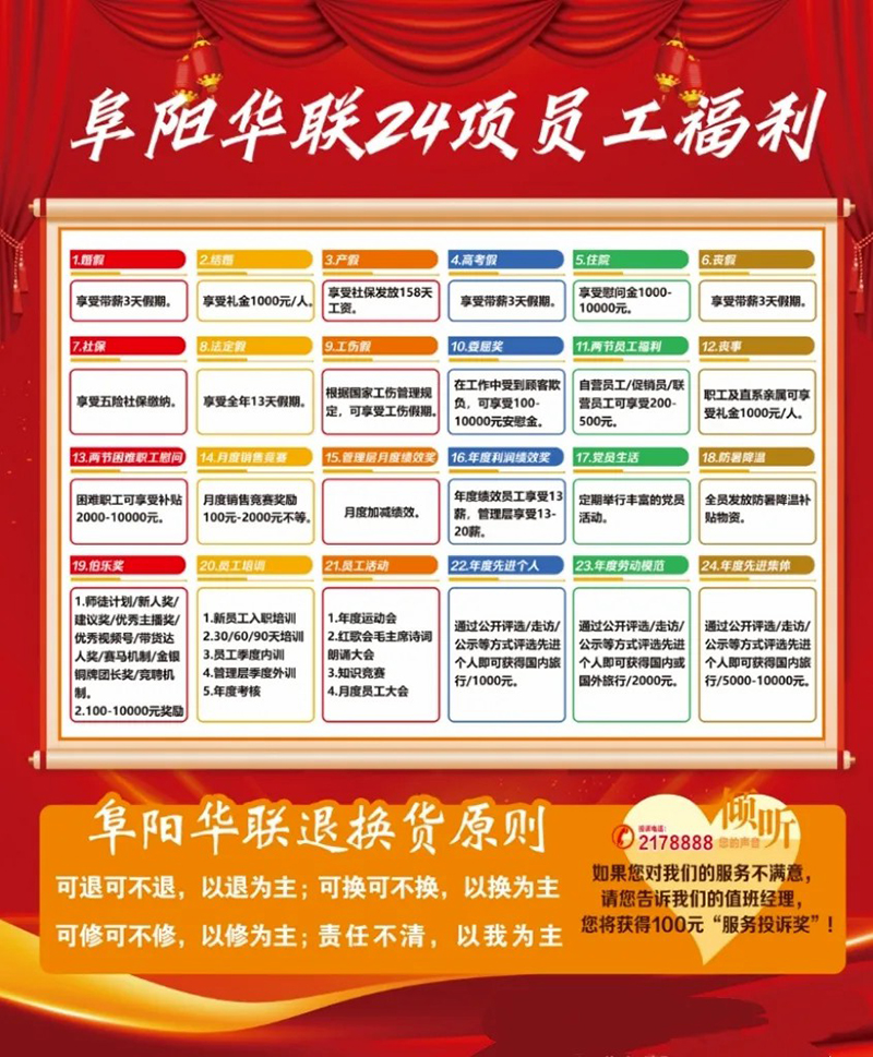 然而,更深層的真情體現在企業(yè)內部的3000余名員工身上。在阜陽(yáng)華聯(lián)總部,清晰展示著(zhù)一項特殊記錄:多年來(lái),企業(yè)為員工系統化創(chuàng )設并陸續完善了24項福利政策。這份清單遠不止法定的社保,它細致地涵蓋了健康關(guān)懷、生活保障、成長(cháng)激勵、禮金慰問(wèn),以及長(cháng)期的貢獻認可。