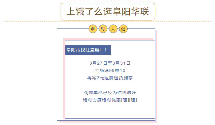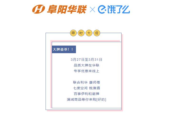 【你好阜陽(yáng),我是華聯(lián)】 3月27日至3月31日 餓了么攜手阜陽(yáng)華聯(lián)送福利