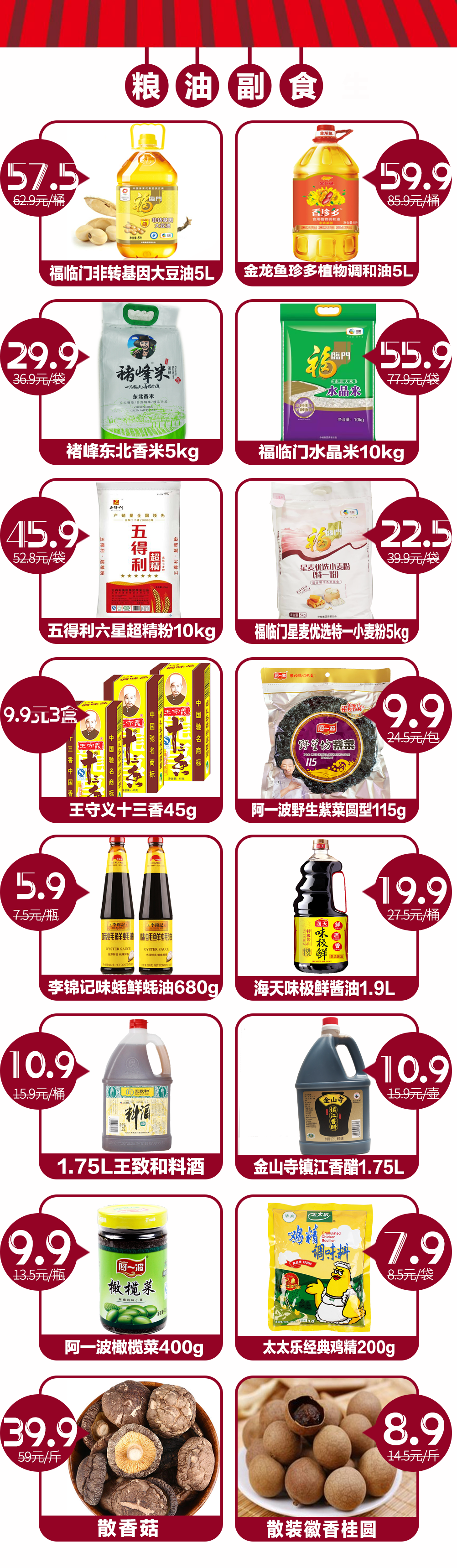 福臨門(mén)非轉基因大豆油、褚峰東北香米、五得利六星超精粉,海天味極鮮,
