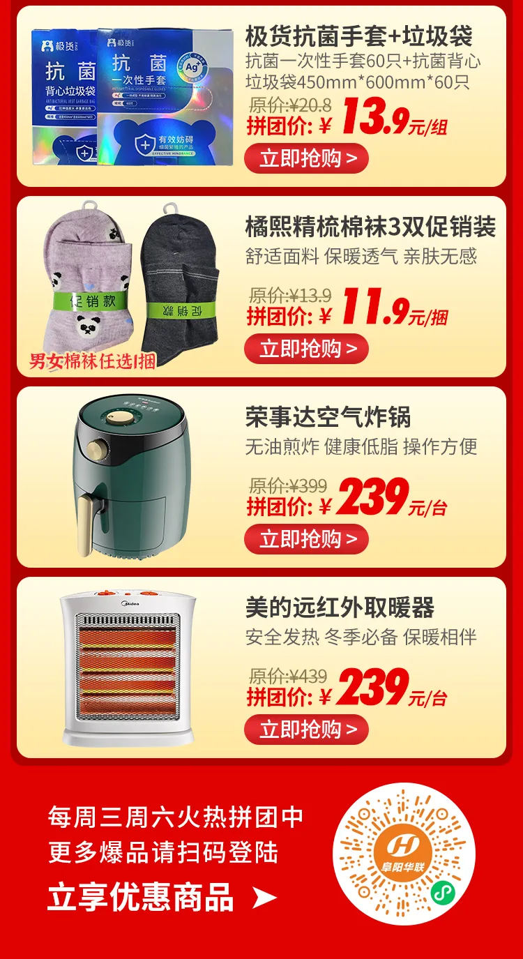 阜陽(yáng)華聯(lián)優(yōu)選1·12拼團,搶?zhuān)盒迈r美味+保暖好物!